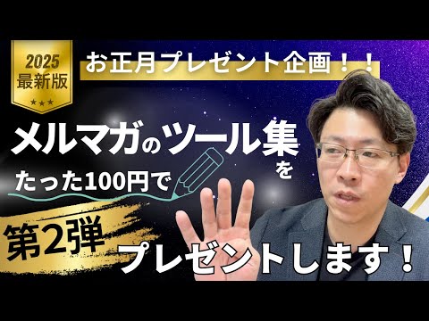 2025年お正月プレゼント企画!第2弾:メルマガのノウハウ・ツール集をたった100円でお渡しします! メルマガノウハウ Twitter Facebook はてブ Pocket LINE コピー 2025.10.26 スポンサーリンク スポンサーリンク 2025年 ビジネスをスケールさせるための『7つのビックオファー』 ...