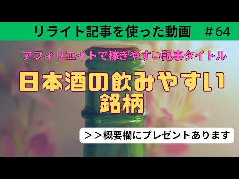 アフィリエイトで稼ぎやすい「日本酒の飲みやすい銘柄」のリライト記事動画★記事のプレゼントもあります★ アフィリエイトについて Twitter Facebook はてブ Pocket LINE コピー 2026.01.15 スポンサーリンク スポンサーリンク アフィリエイトで稼ぎやすい記事のジャンルを、動画にして紹介しています。 今回の動画は【日本酒の飲みやすい銘柄】です。